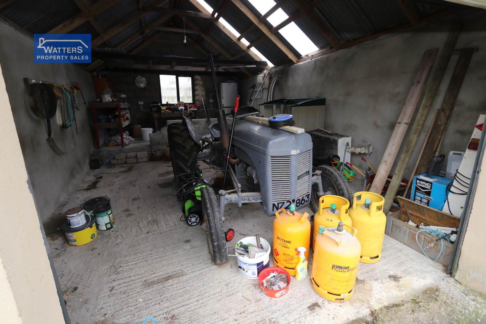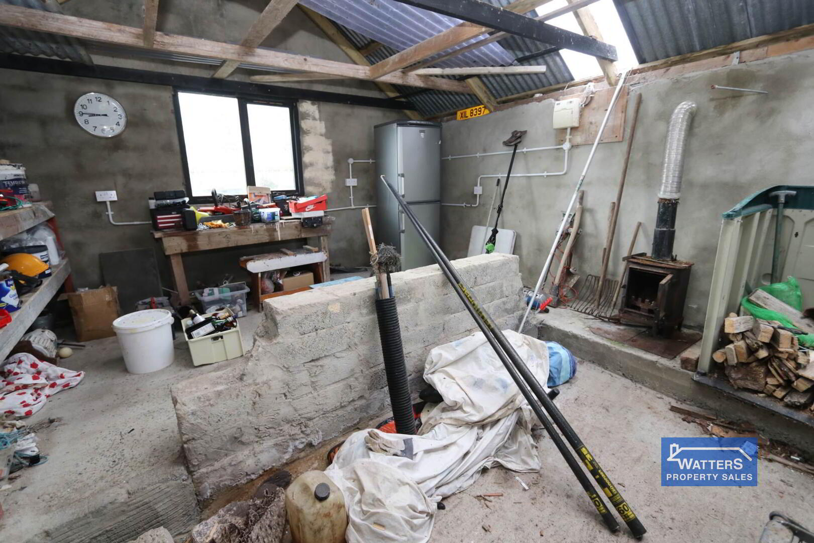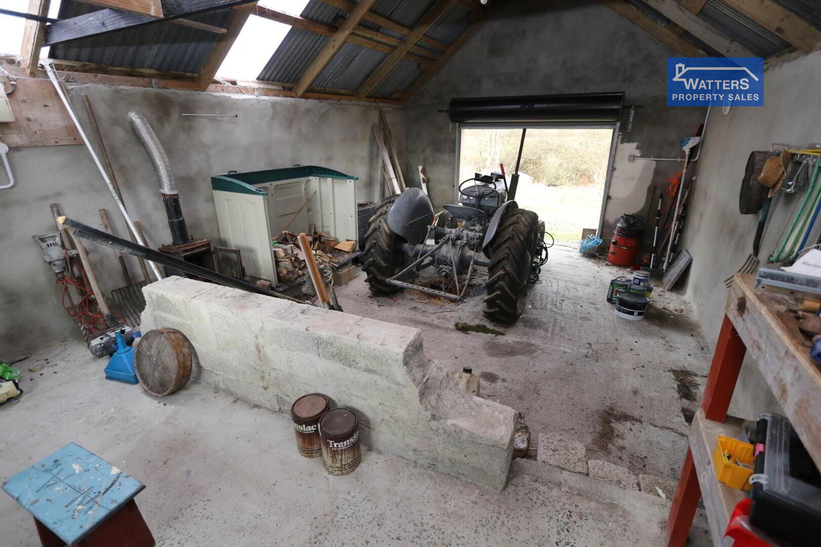 Outside, the property is accessed via stone driveway that offers parking for multiple vehicles, there is a garage/ workshop with a wood burning stove and roller door. There is a further shed with a store which would be prime for stables or hobby farming with direct access to the lands.