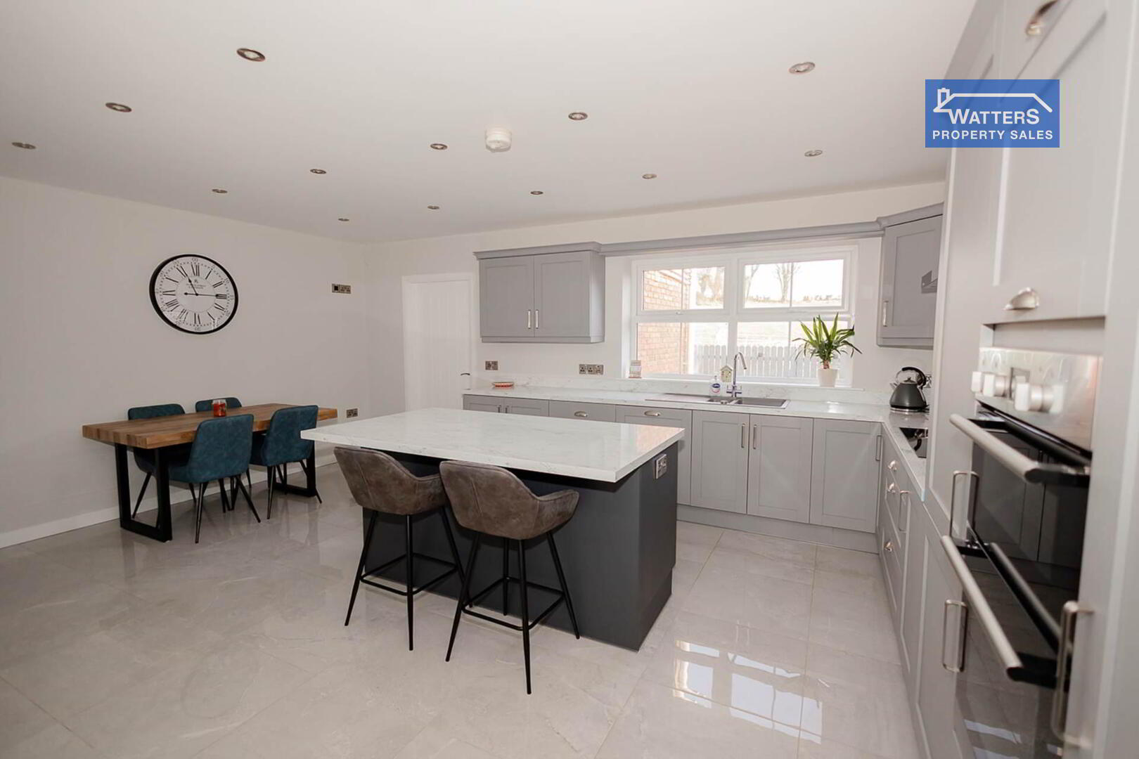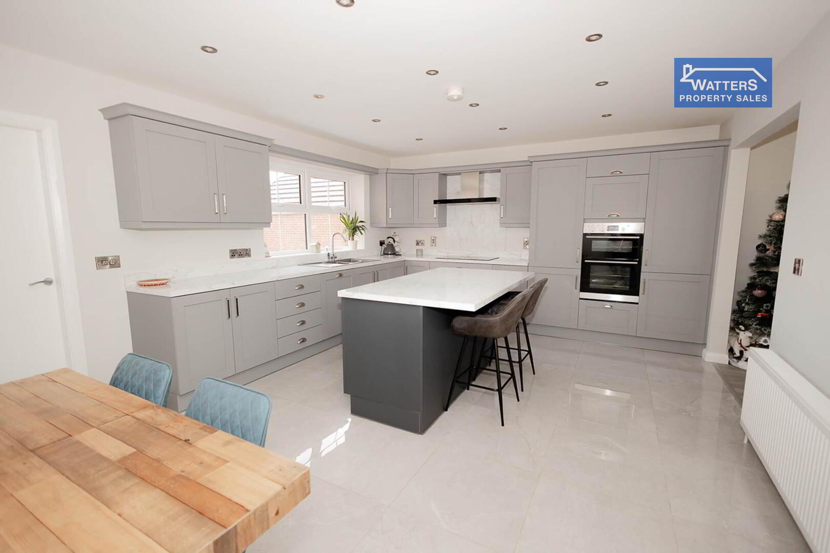 The kitchen features a statement island with storage and electric, making it a true centrepiece for family life and entertaining, along with a double oven, induction hob, dishwasher and a full range of high-end integrated appliances.