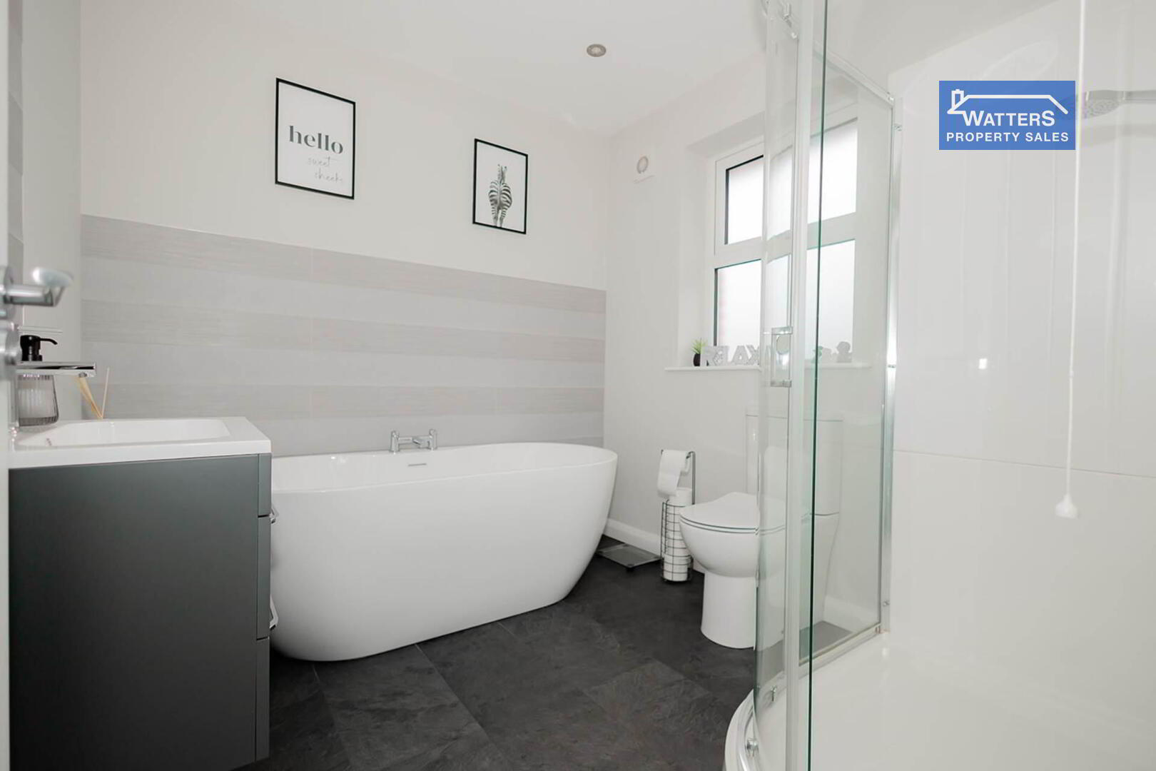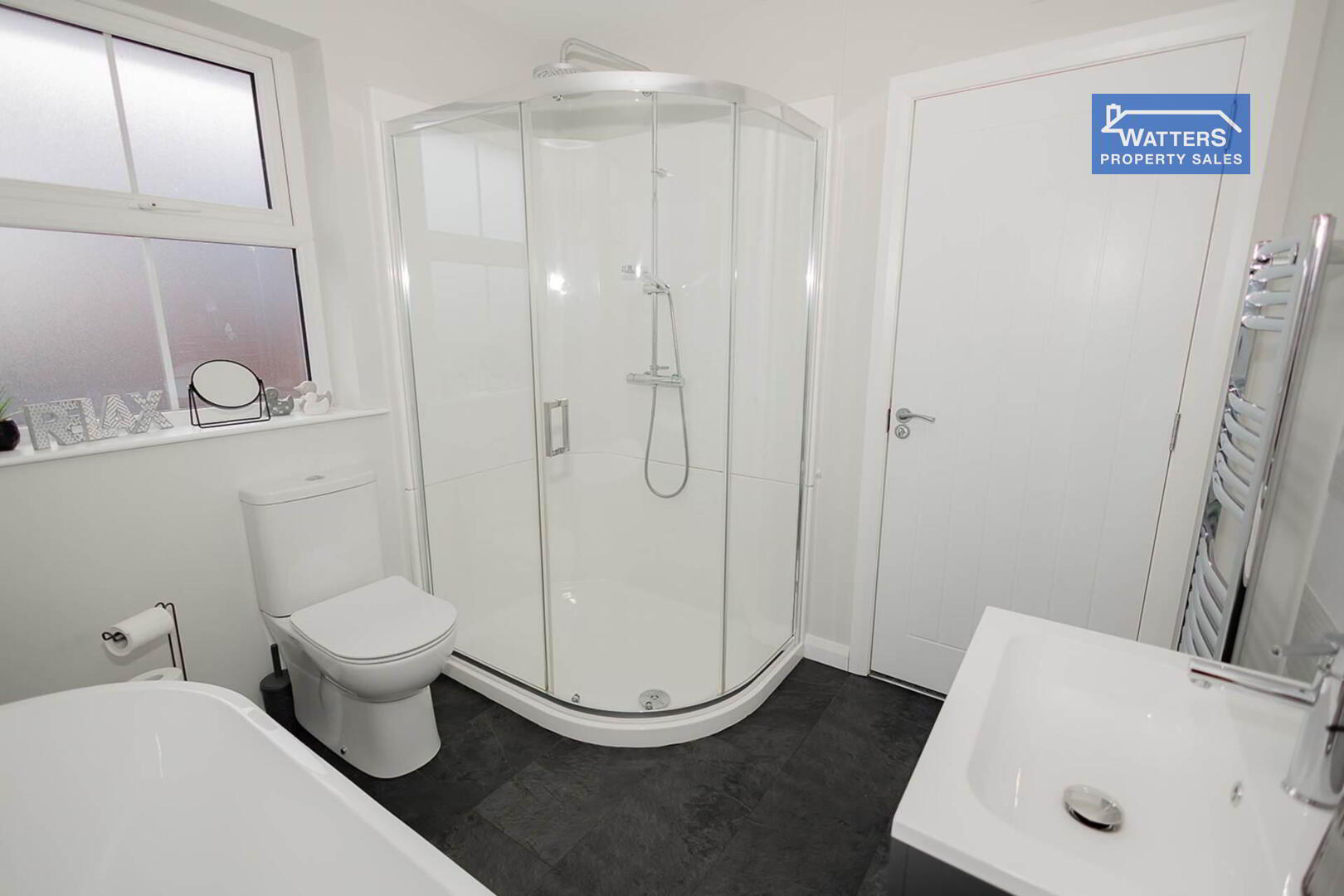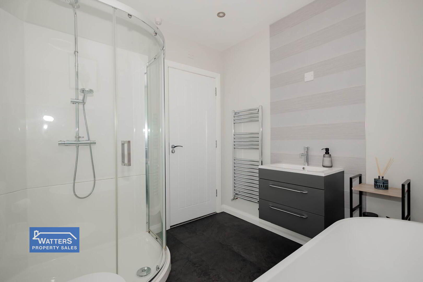 Upstairs, there are three spacious bedrooms, including a luxurious master suite with a sleek en-suite shower room. The family bathroom offers true spa-like indulgence, complete with a freestanding bathtub, and a rain shower inside a POD shower system.