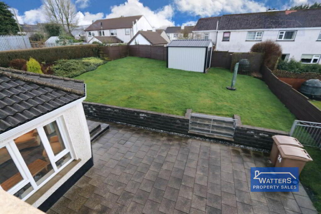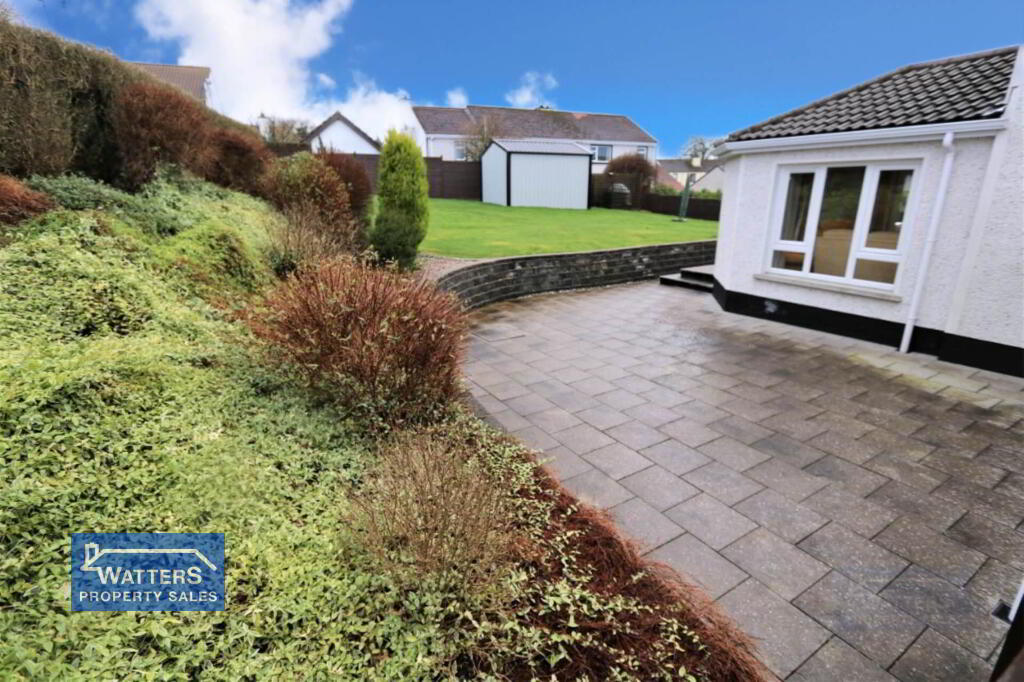 The property is approached by a gently sloping tarmac driveway bordered by well-maintained lawns and shrubs. The enclosed south facing rear garden and patio offers an excellent family area with lawns, hedging, shrubbery and a prefab shed. The current vendors have erected a wooden fence to the front of the property to enclose the garden.