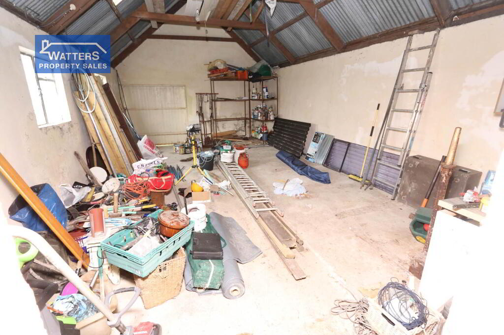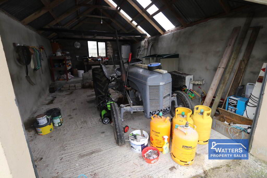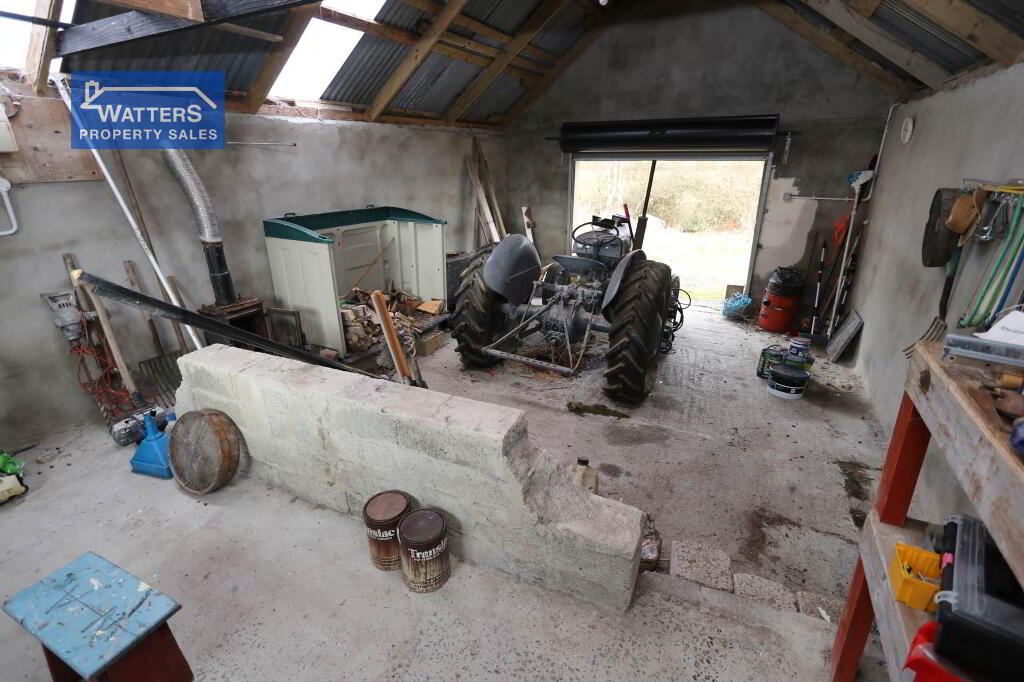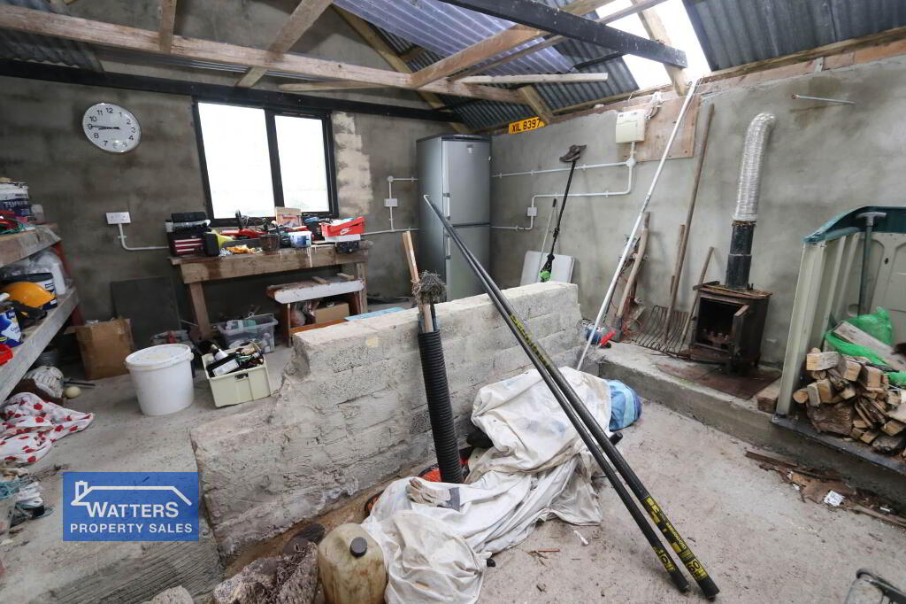 Outside, the property is accessed via stone driveway that offers parking for multiple vehicles, there is a garage/ workshop with a wood burning stove and roller door. There is a further shed with a store which would be prime for stables or hobby farming with direct access to the lands.