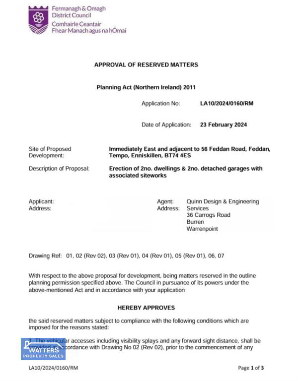 A fantastic opportunity to acquire a prime building site with full planning permission for a bungalow and garage, nestled in a peaceful countryside setting just over two miles from Enniskillen.